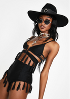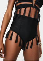 High waisted bottoms in stretch poly spandex with an elastic waistband and fringe detail