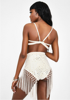 Our Vienna Bottoms may be perfection. So soft with the perfect amount of stretch. Made with our knit fabric with mirror sequins sewn into the fabric. Peek-a-boo side panels and high waisted. Macrame fringe front to back.