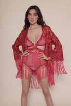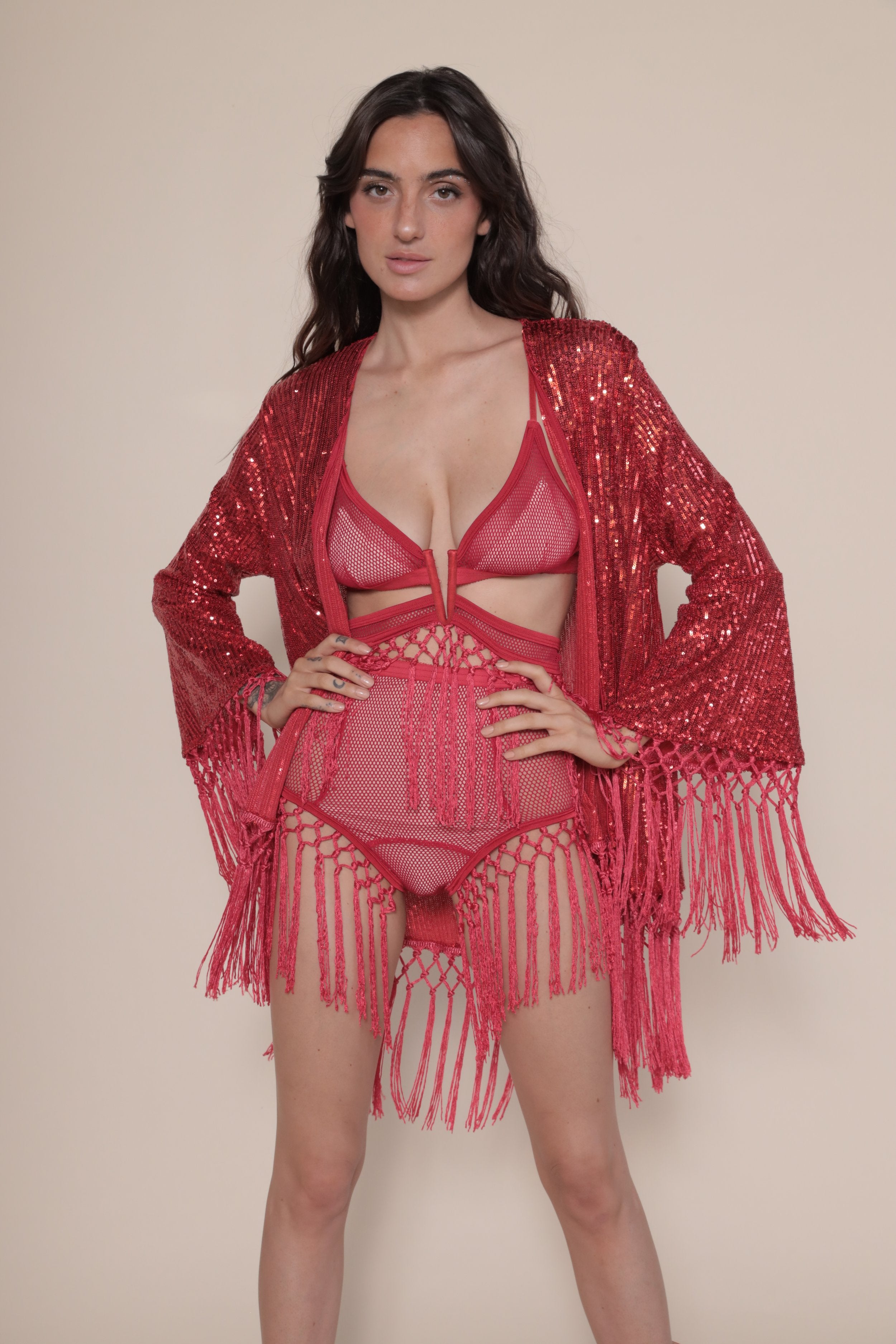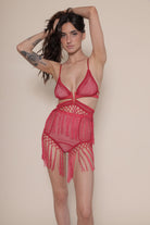 Fabric: white knit mesh and Stretch poly spandex with an elastic waistband and macrame fringe detail