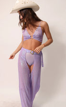 Solid stretch sequin underwear in in knit fabric, soft light lining, and soft stretchy elastic waistband. Shown with the Quinn Top in Sequin and the Solid sequin Disco Bra. Model also shown wearing the Starry Night cowboy hat.