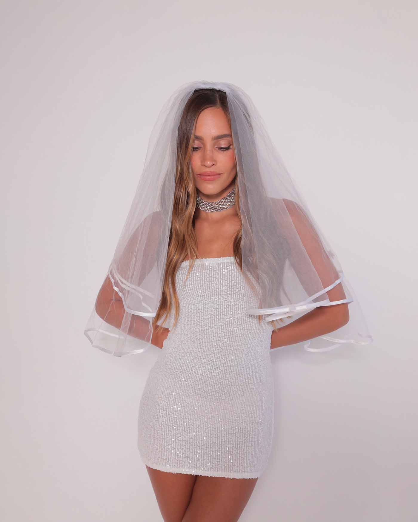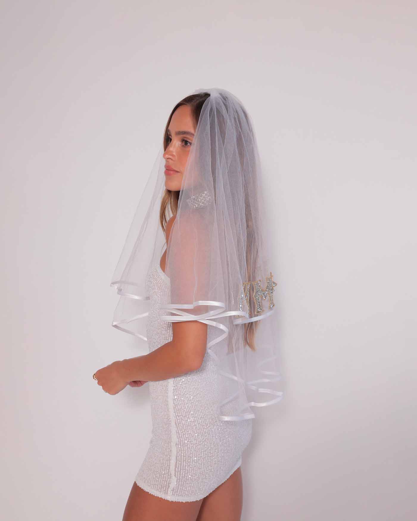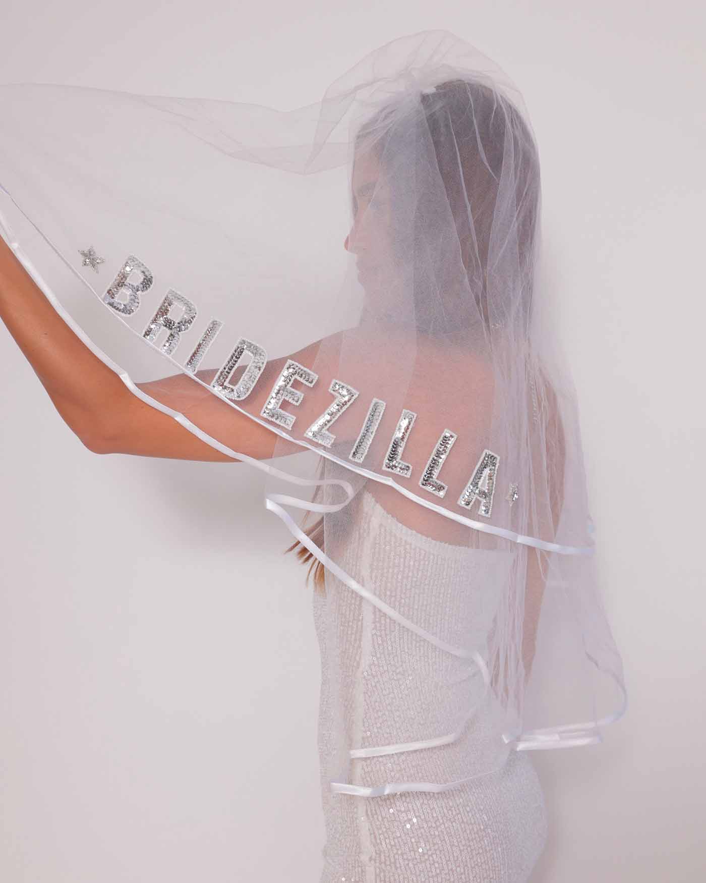 Who decided that being a Bridezilla is a bad thing? We say, embrace it. Our Bridezilla veil is a two tier veil with satin ribbon lining. Handmade beaded and sequin appliqué 'Bridezilla' lettering on the back.