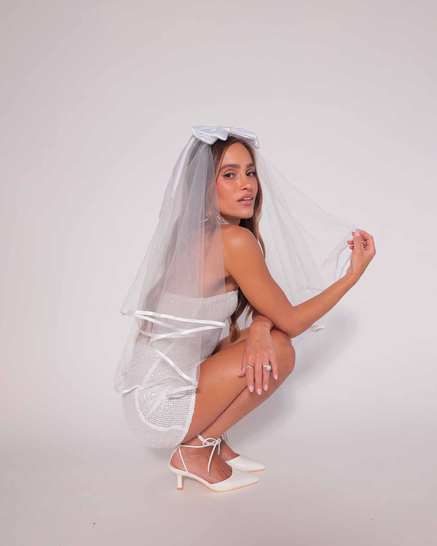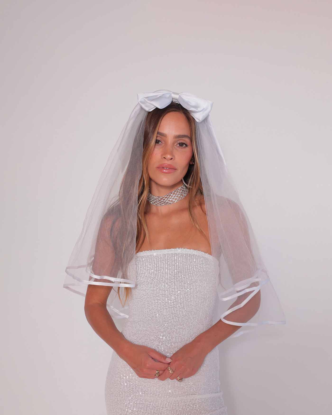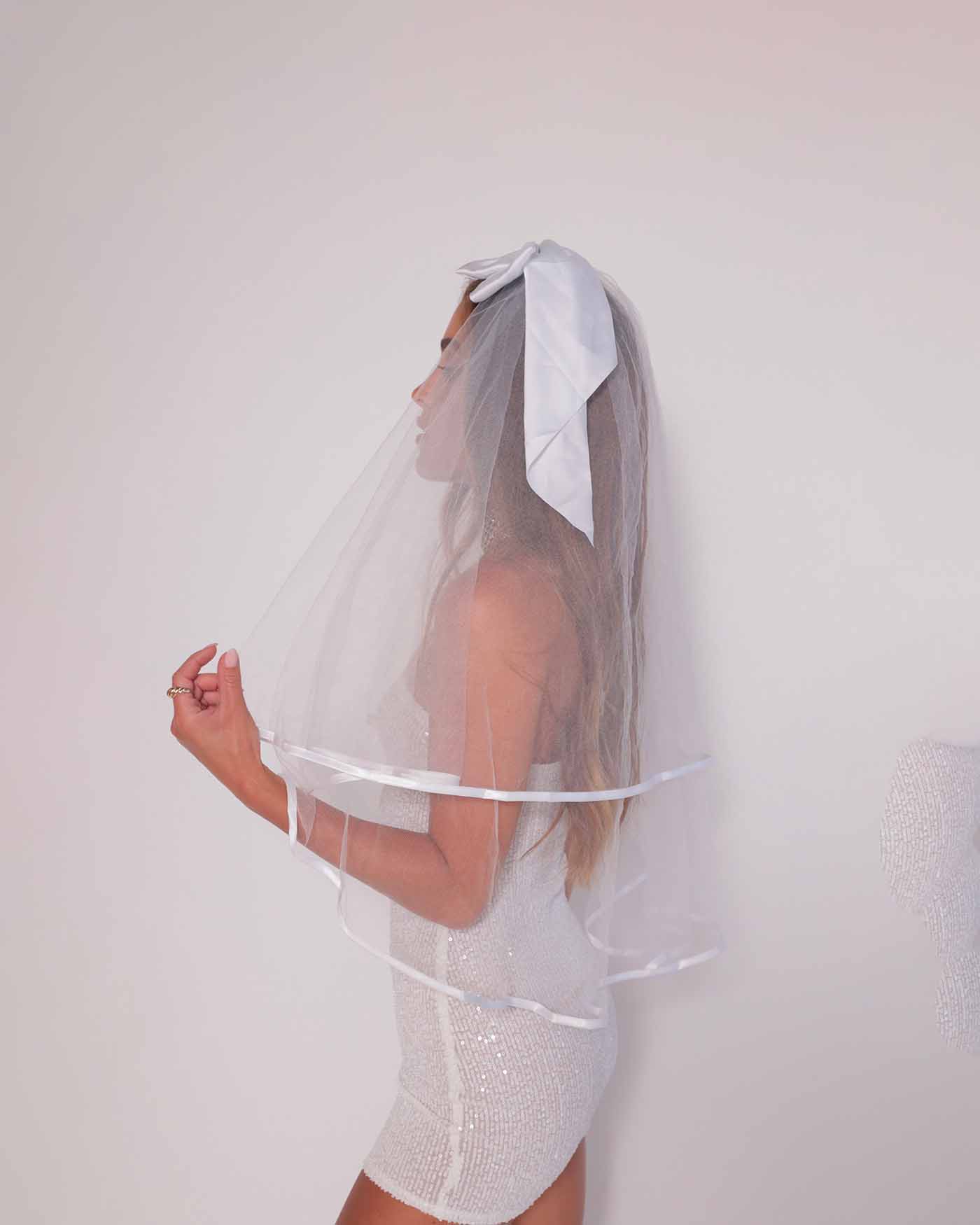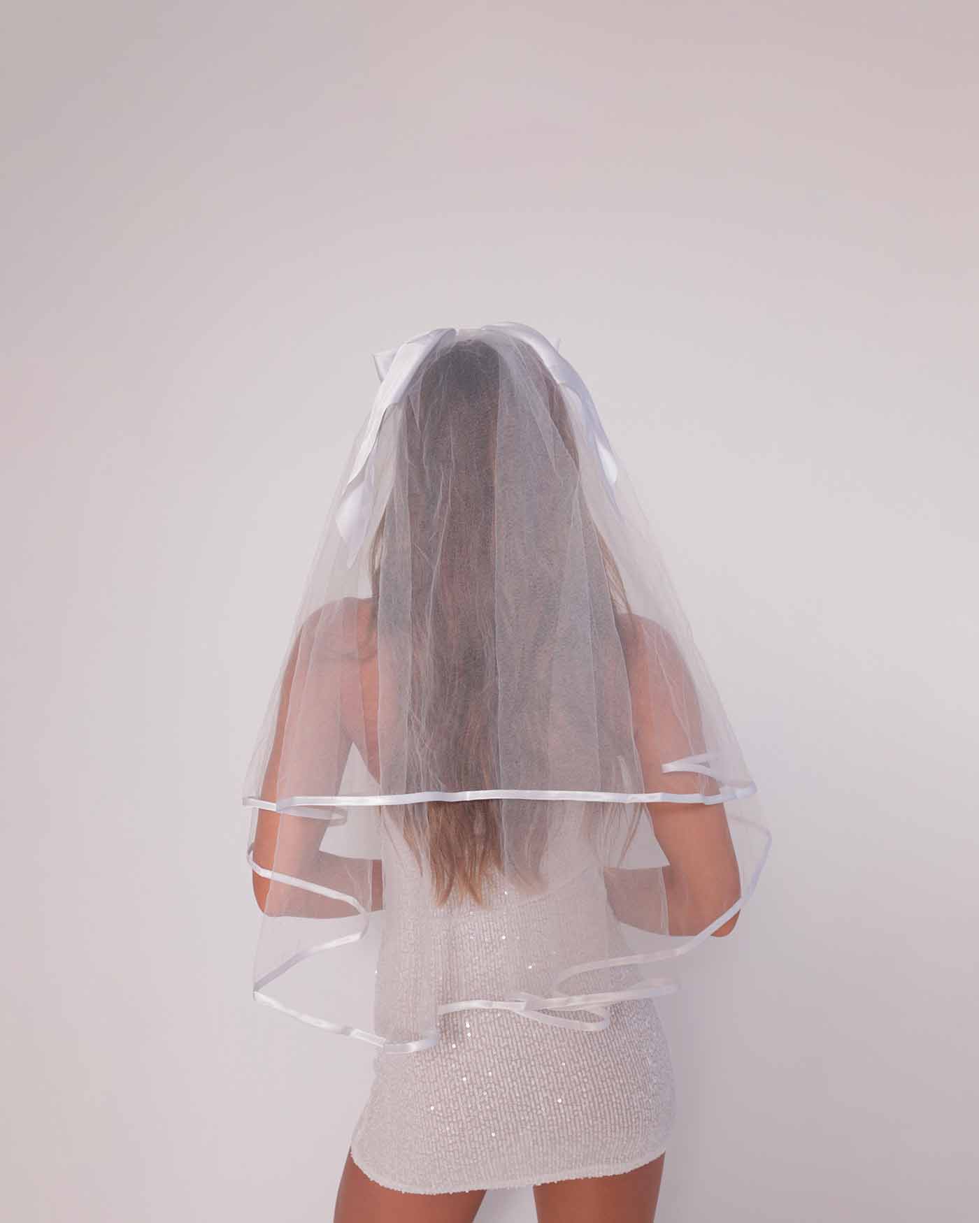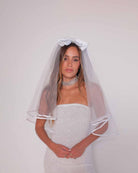 Our Celine Veil is super floofy and super cute. Tulle with satin trim with matching satin bow on top. Holds its shape. Elbow length in front graduating to waist length in back. Two tier, drop veil, comb attachment. Made to order.