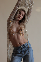 Shown with Madonna Chain Bra, Madonna Belly Chain, Ultra Mini Skirt, Twisted Top in Sequin Net, Jackson Cowboy Hat, Pearl Chain Bra, Pearl and Chain Belly Chain, Custom Cowboy Hat
