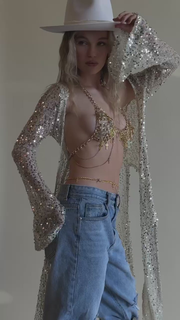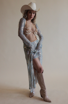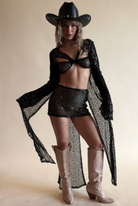 Our Bolero Duster in our sequin knit fabric is soft on the skin and sparkly on the outside. This sheer, floor dusting duster stretches and forms to the body like a knit sweater and catches the light creating an eye-catching shimmery wet look. Bell sleeves are fitted through the elbow and hit at the knuckle. High splits hit as the low waist creating flowy, breezy movement.