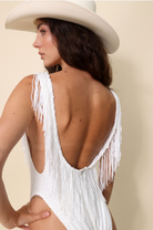 One Piece Bodysuit with monochromatic sparkle sequin fringe and star appliqué detail.