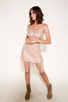 Sequin knit mini skirt with soft lining and an invisible zipper and long macrame rayon trim.