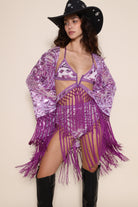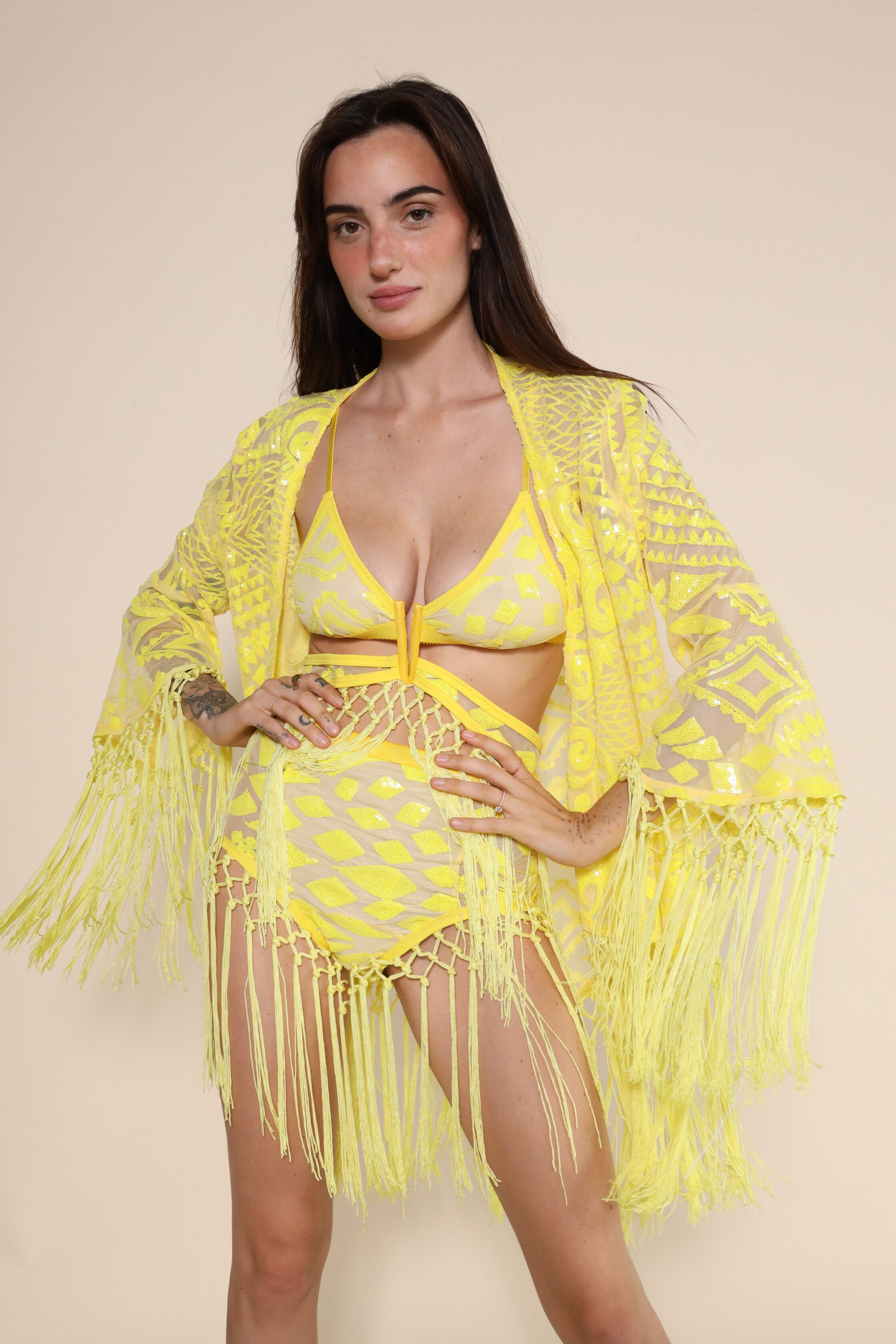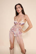 Fabric: Sequin embroidered Mesh and Stretch poly spandex with an elastic waistband and macrame fringe detail