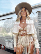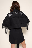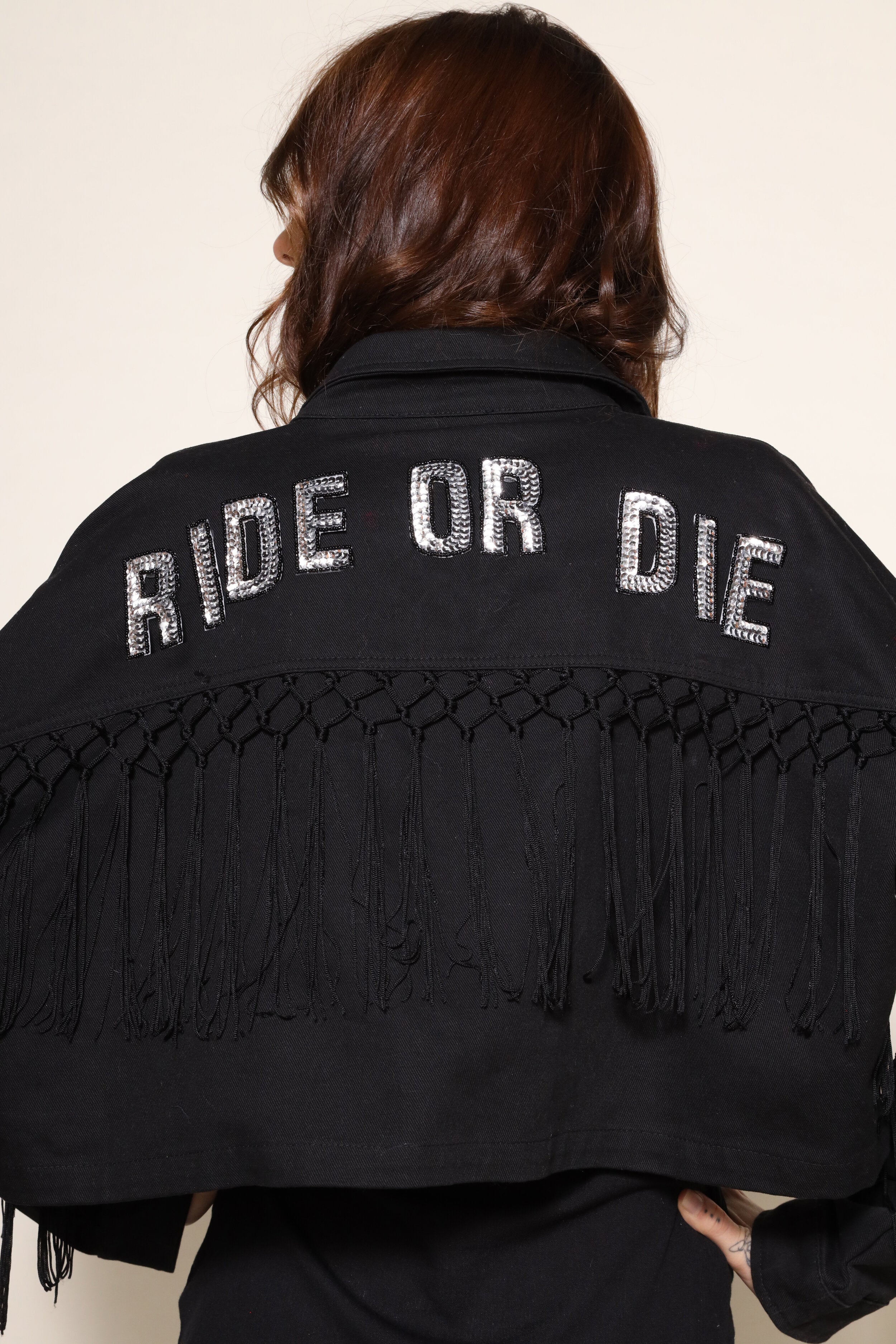 Washed Recycled Denim Jacket with macrame fringe and handmade sequin and beaded lettering; hand sewn onto jacket