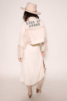 Washed Recycled Denim Jacket with sequin fringe and handmade sequin and beaded lettering; hand sewn onto jacket