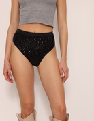 Solid stretch sequin underwear in in knit fabric, soft light lining, and soft stretchy elastic waistband. Shown with the Quinn Top in Sequin and the Solid sequin Disco Bra. Model also shown wearing the Starry Night cowboy hat.