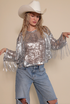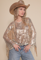 Our Dakota Jacket is made with our gold square sequin fabric. Soft on the skin and lightweight with bell sleeves and long macrame rayon fringe trim along sleeves and bottom.