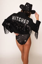 Washed Recycled Denim Jacket with sequin fringe and handmade sequin and beaded lettering; hand sewn onto jacket