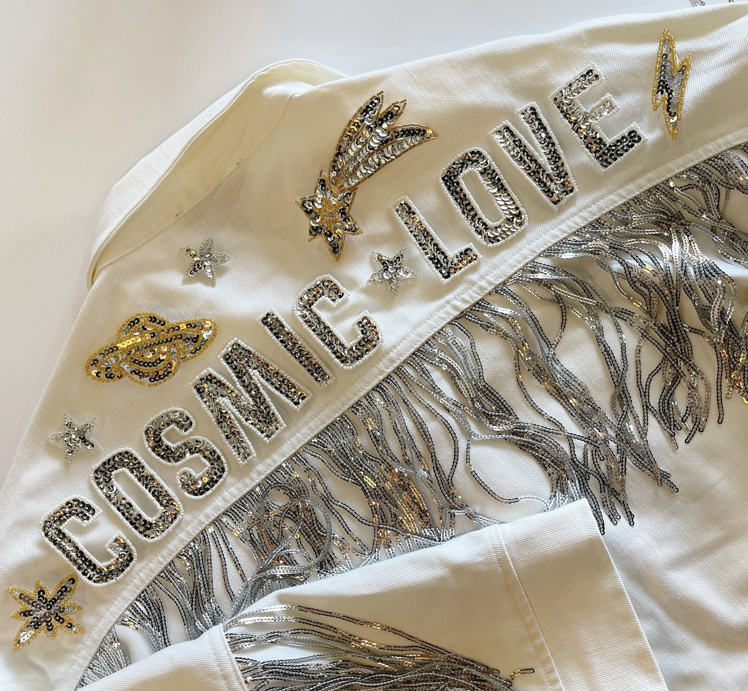 Washed Recycled Denim Jacket with sequin fringe and handmade sequin and beaded lettering; hand sewn onto jacket