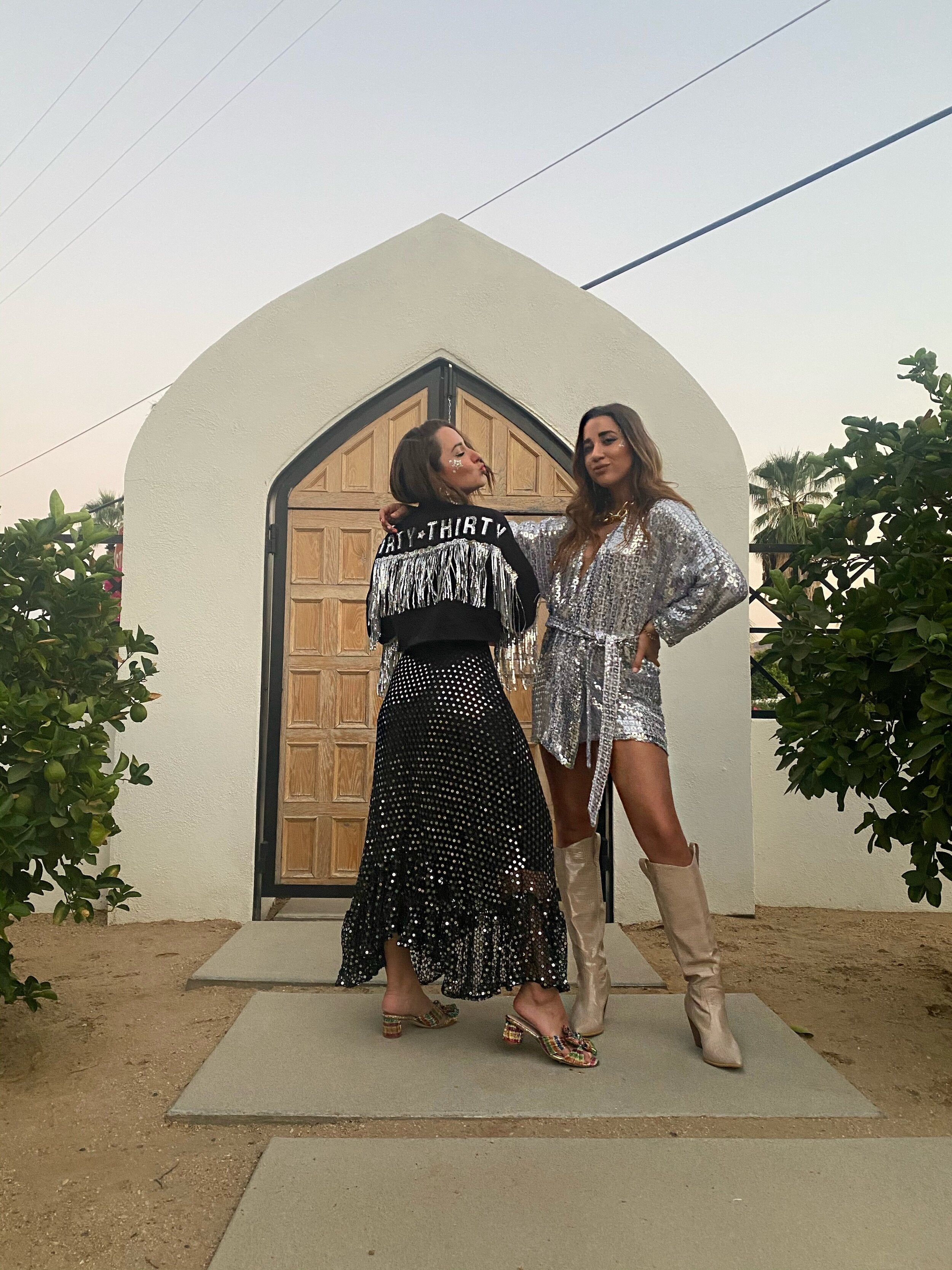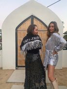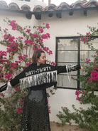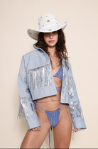 Washed Recycled Denim Jacket with sequin fringe and handmade sequin and beaded lettering; hand sewn onto jacket