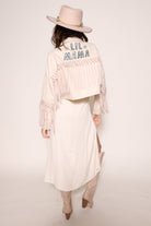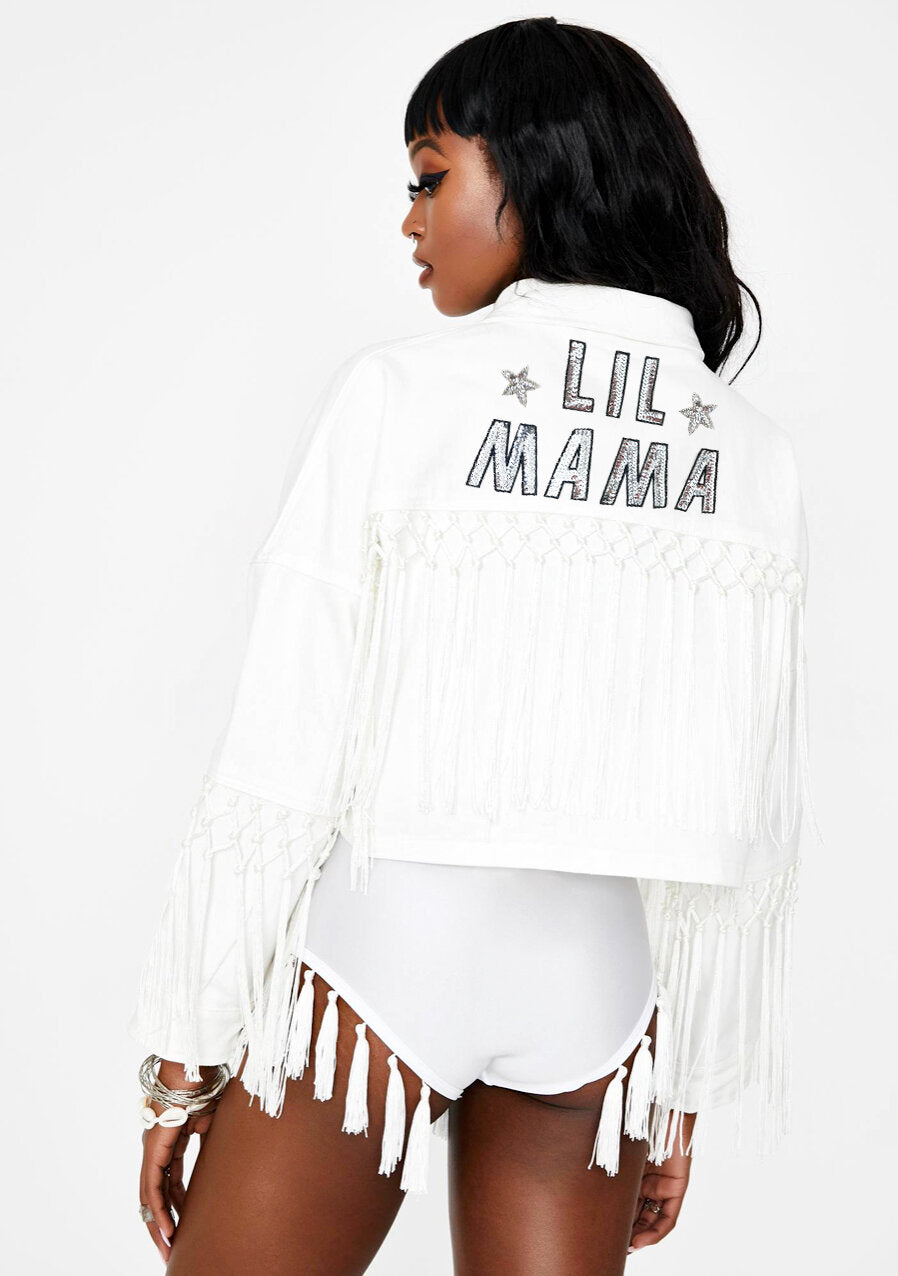Washed Recycled Denim Jacket with macrame fringe and handmade sequin and beaded lettering; hand sewn onto jacket