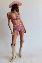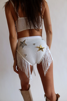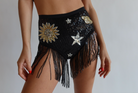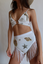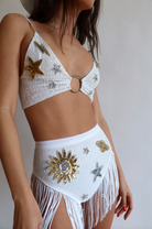Stretch sequin, extra high waisted bottoms with silver sequin stars and celestial motif
