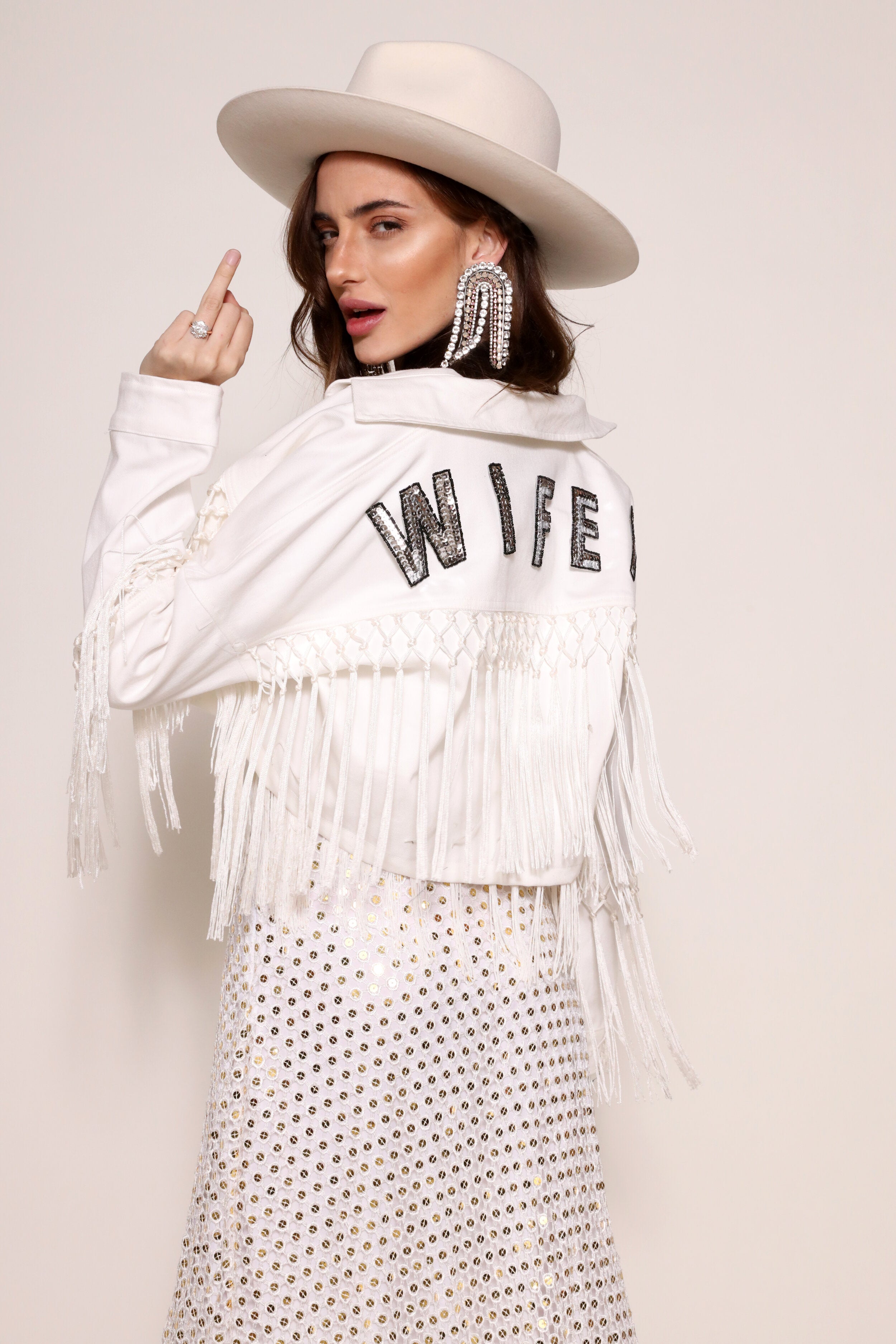 Washed Recycled Denim Jacket with macrame fringe and handmade sequin and beaded lettering; hand sewn onto jacket