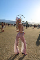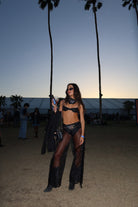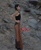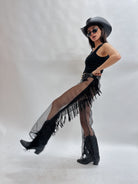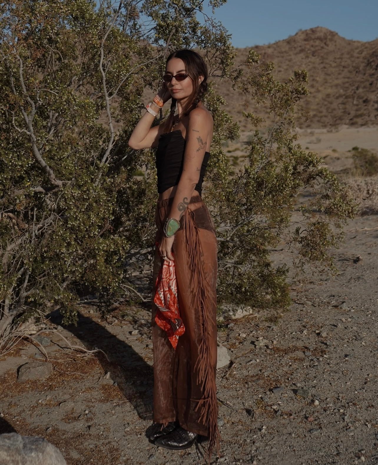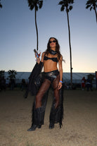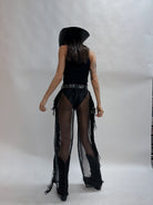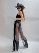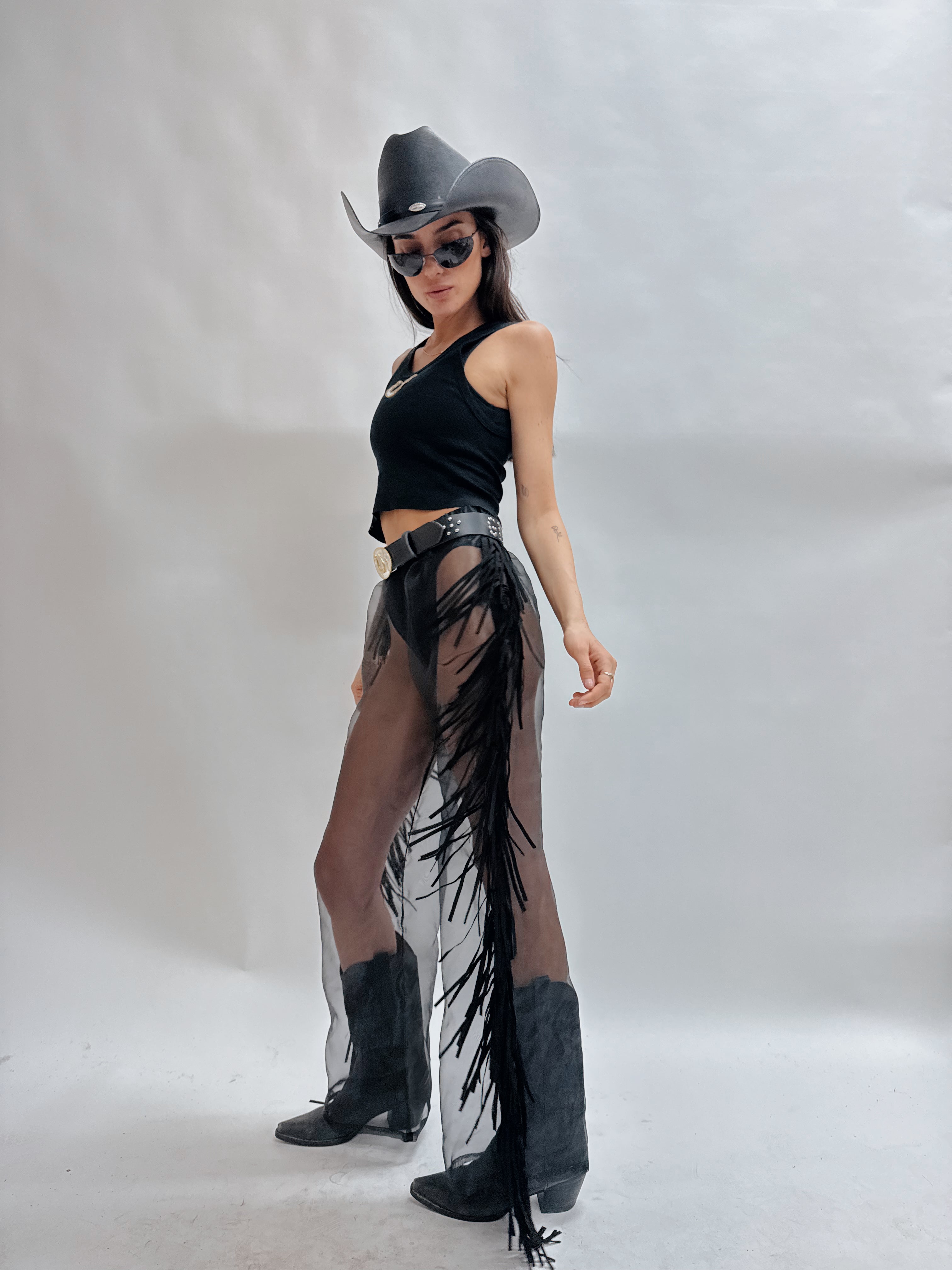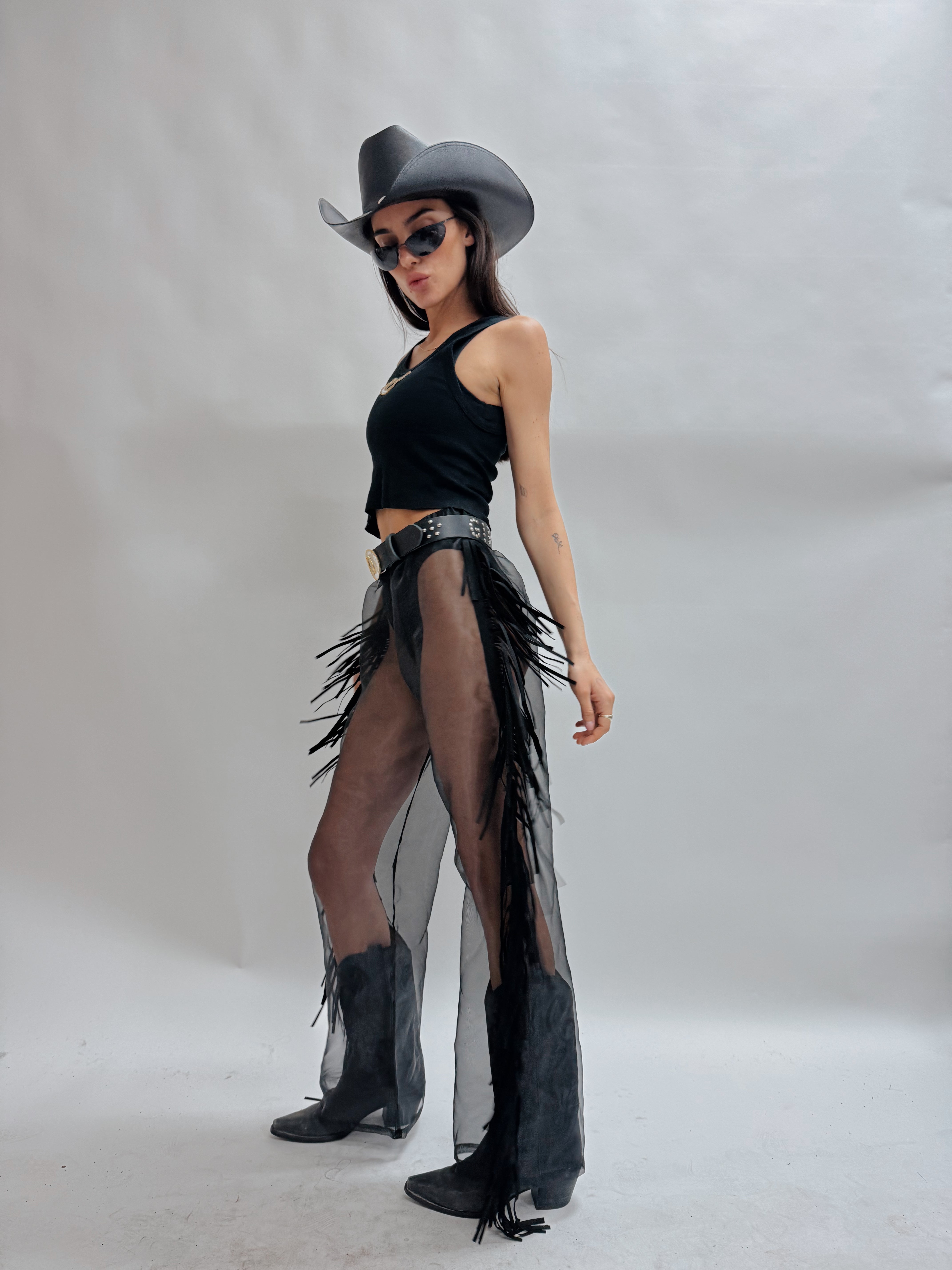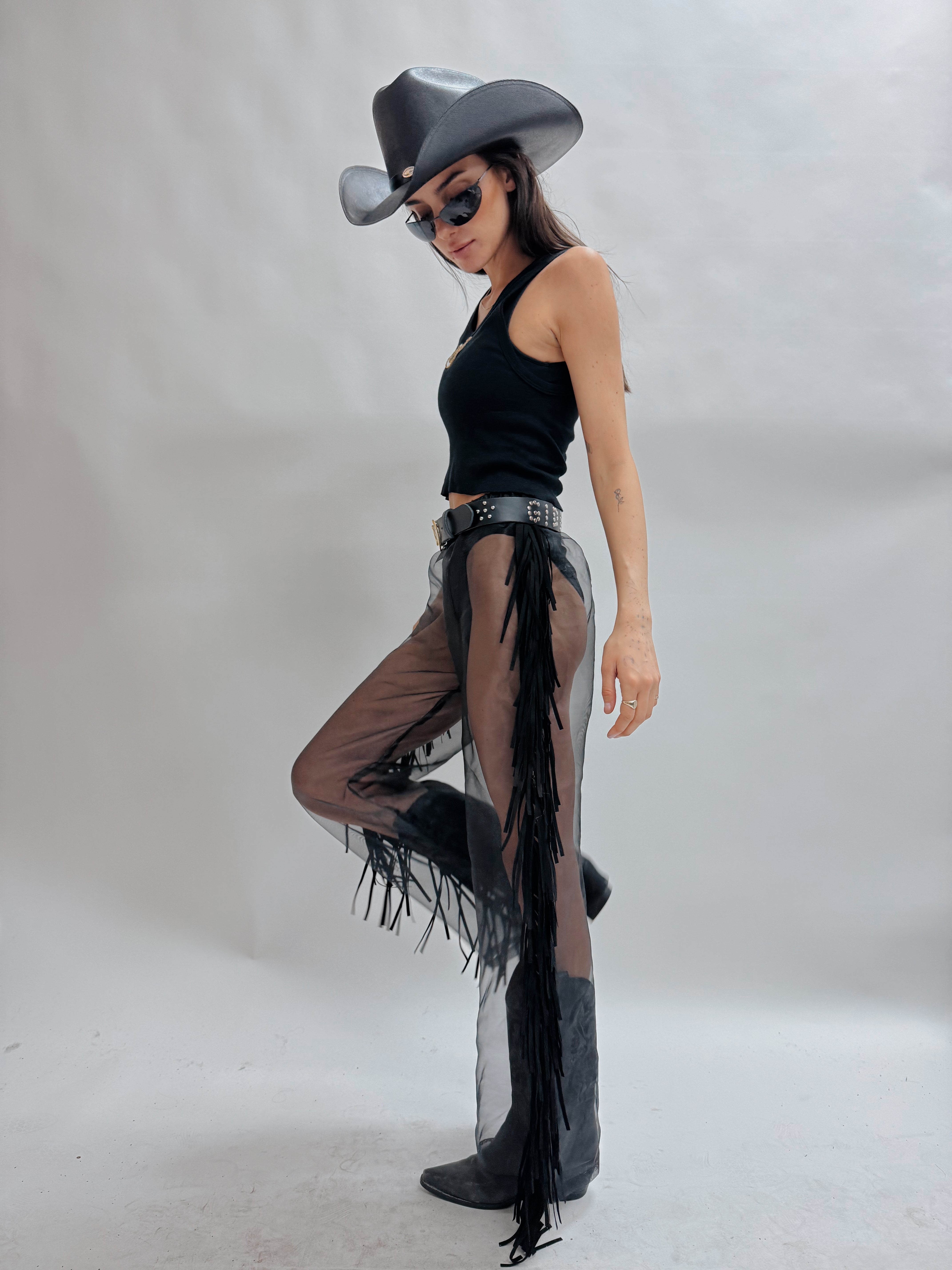 Comfortable, flattering, floor dusting pants in a soft organza with suede fringe trim.