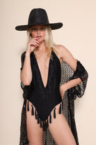 Double lined spandex, cheeky fit, adjustable straps, tassel fringe detail