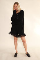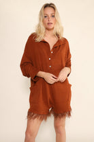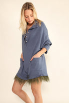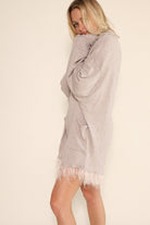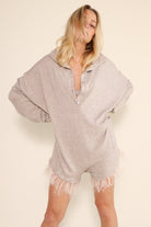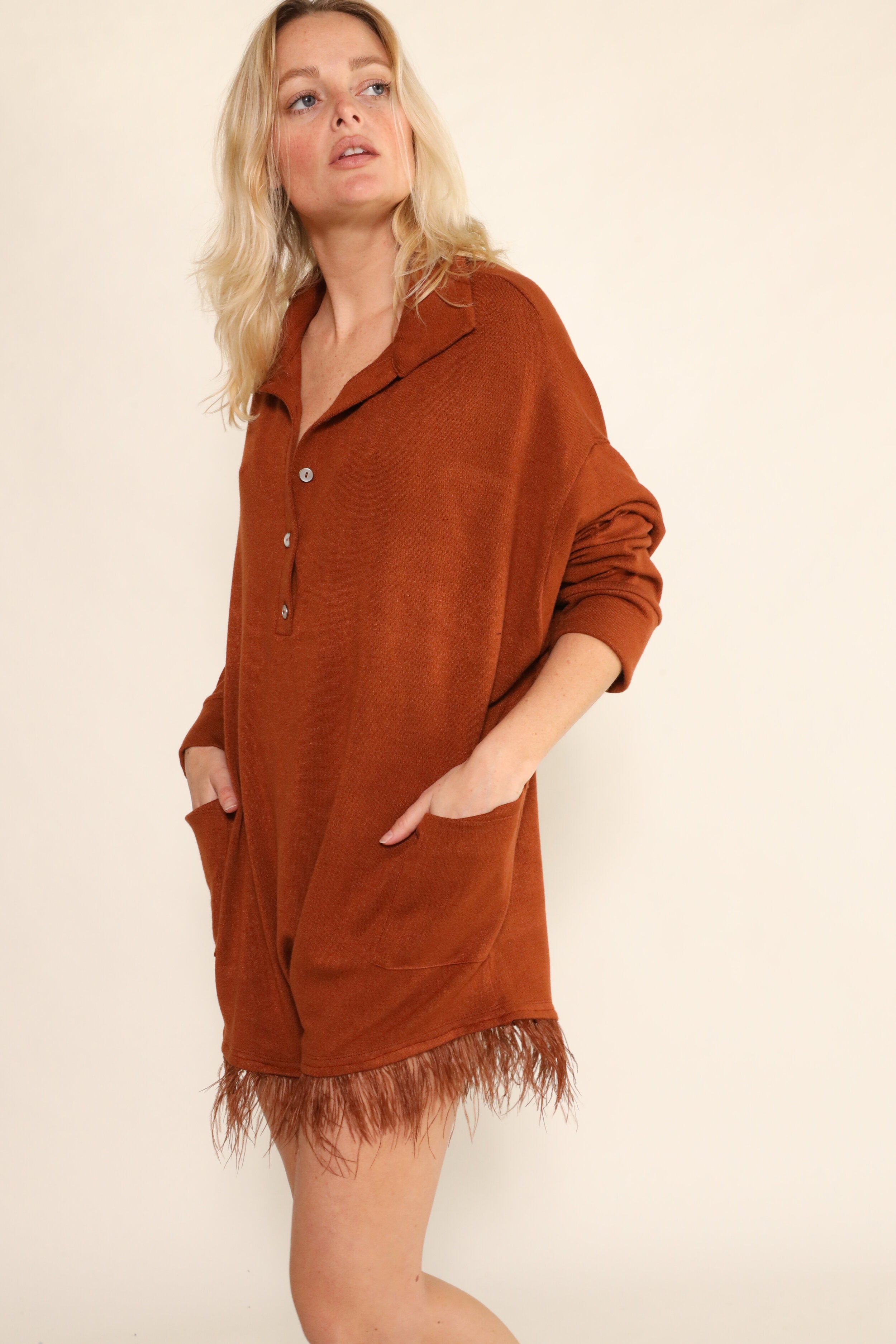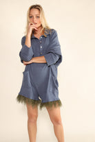Oversized Collared Romper with delicate feather trim for an effortless look