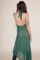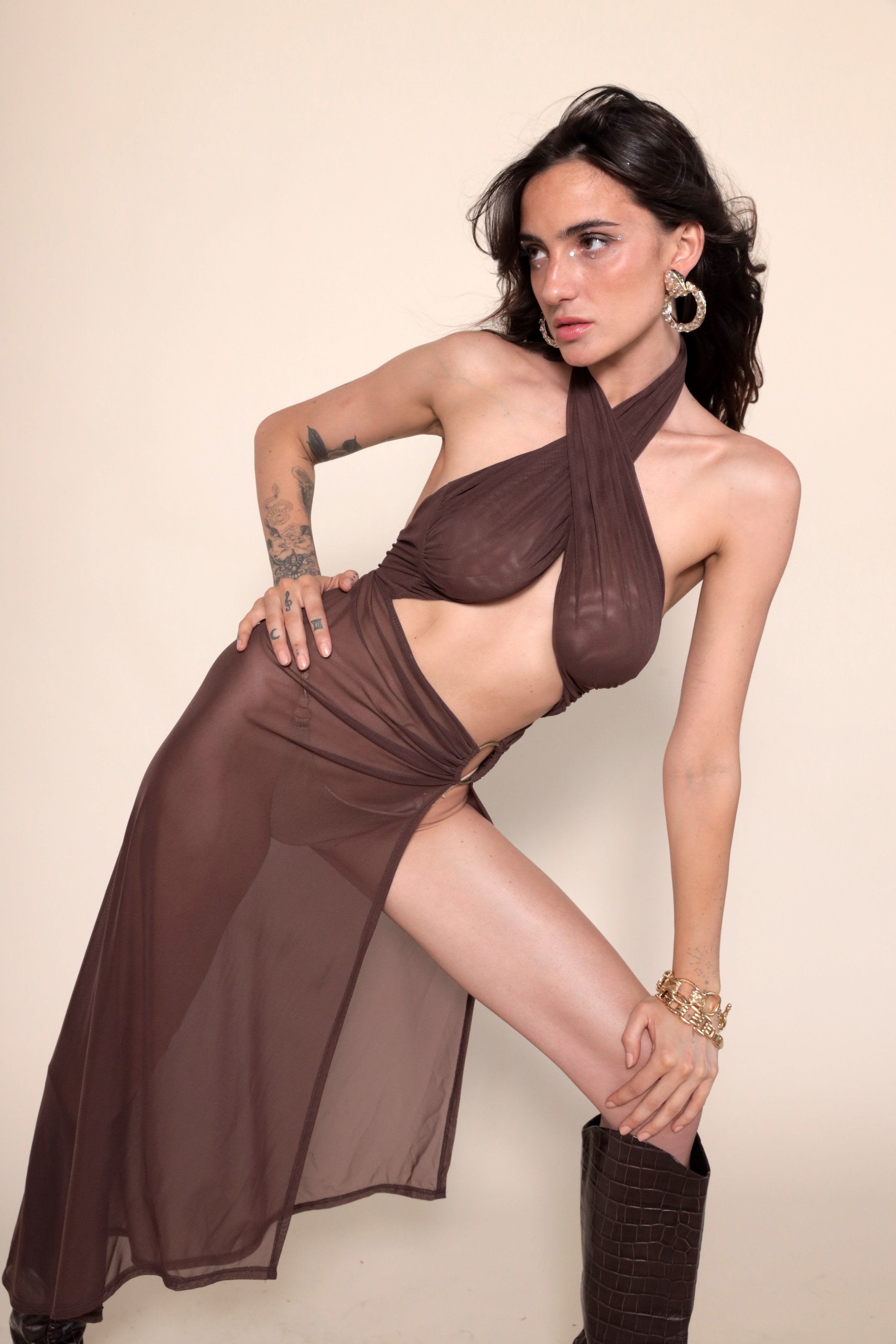 Knit stretch mesh, criss cross halter neckline with tie closure. Elastic waistband and front ring detail.