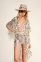 Fabric: Mesh with embroidered gold sequin with an elastic waistband and macrame fringe detail