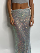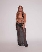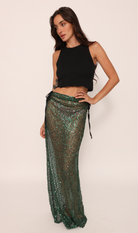 Our Monique Cover Up is made in our beautiful sequin net fabric. It's a lightweight maxi skirt, comfortable on the skin, and of course sparkly. Ties at the side and cinches in to get a completely customizable and flattering fit. Pairs with our Billie Bikini top and bottom for poolside or wear it over micro shorts and a baggy vintage tee for cocktails. Want something without sequins? Try our Claire Cover Up!