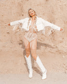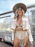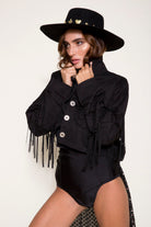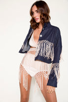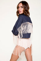 Washed Recycled Denim Jacket with macrame fringe Metal Buttons, Pockets, Collar