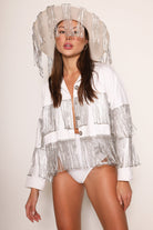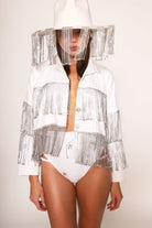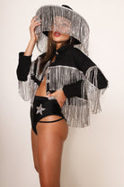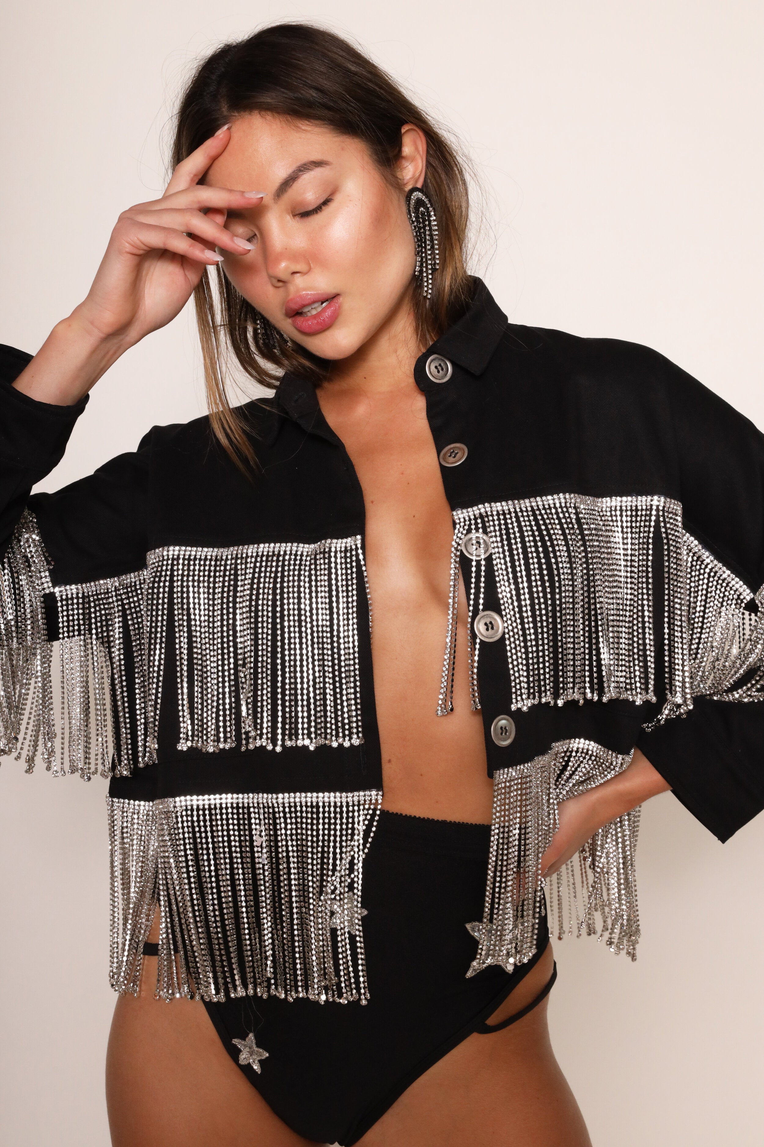 Washed Recycled Denim Jacket with crystal fringe hand sewn on, made to order- turnaround time is about 1 week