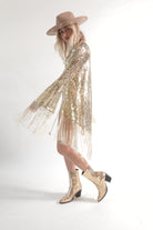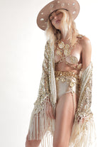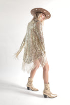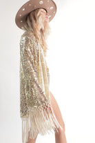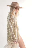 Gold confetti sequin coverup jacket with bell sleeves and long macrame rayon trim.