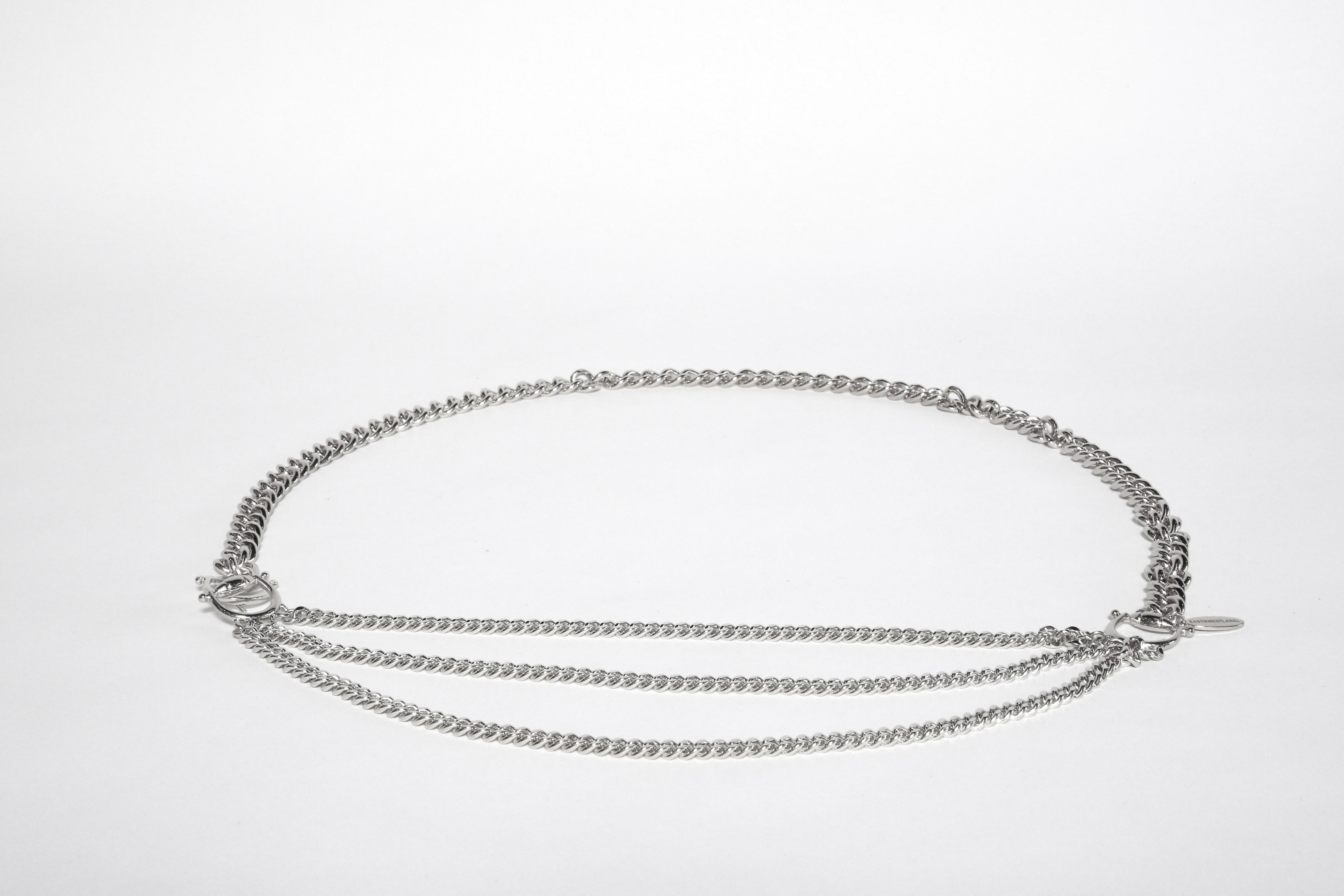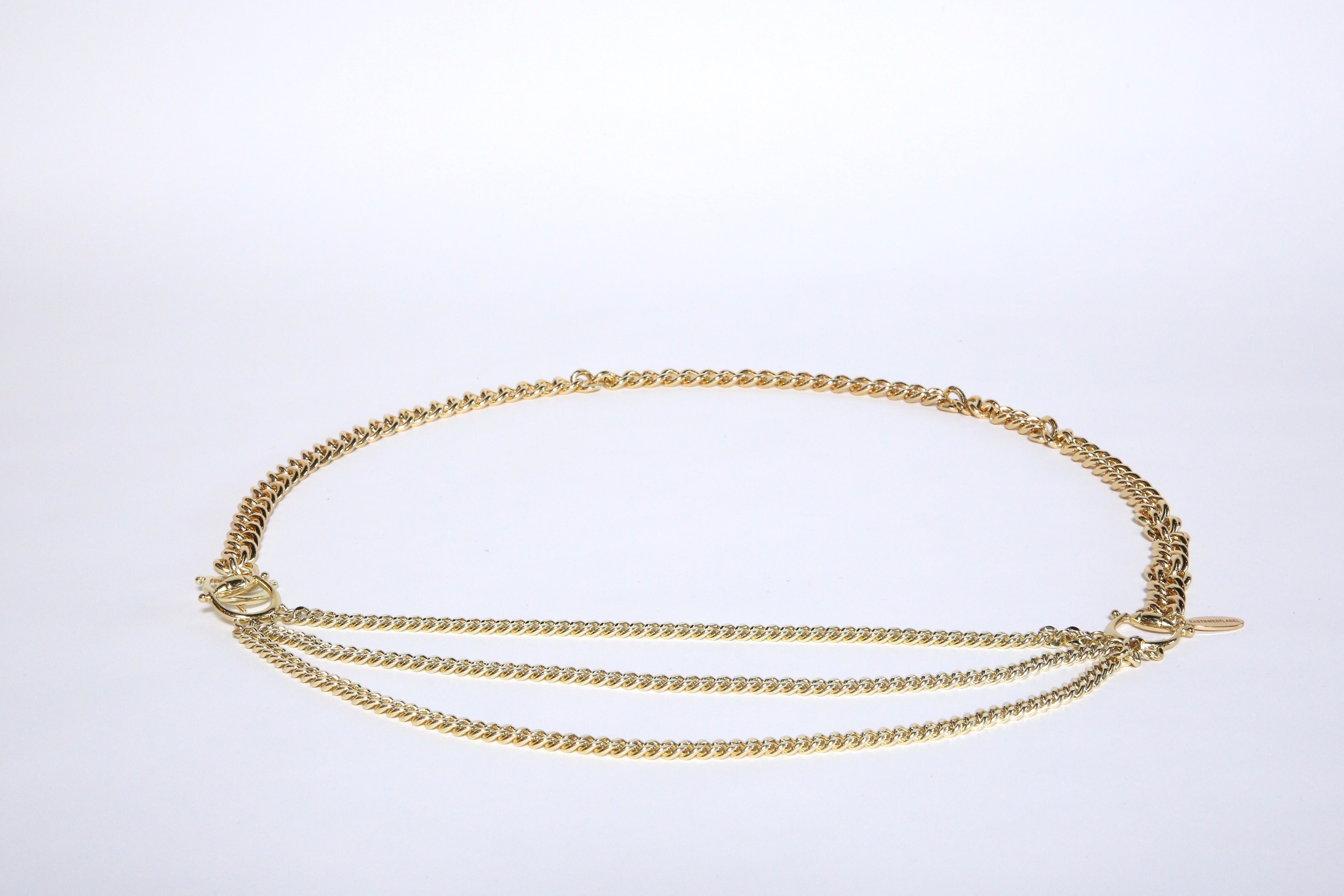 The perfect every day belt, amazing hardware detail on each side of draped chain and the end hanging chain. Has a hook closure making it full adjustable.