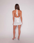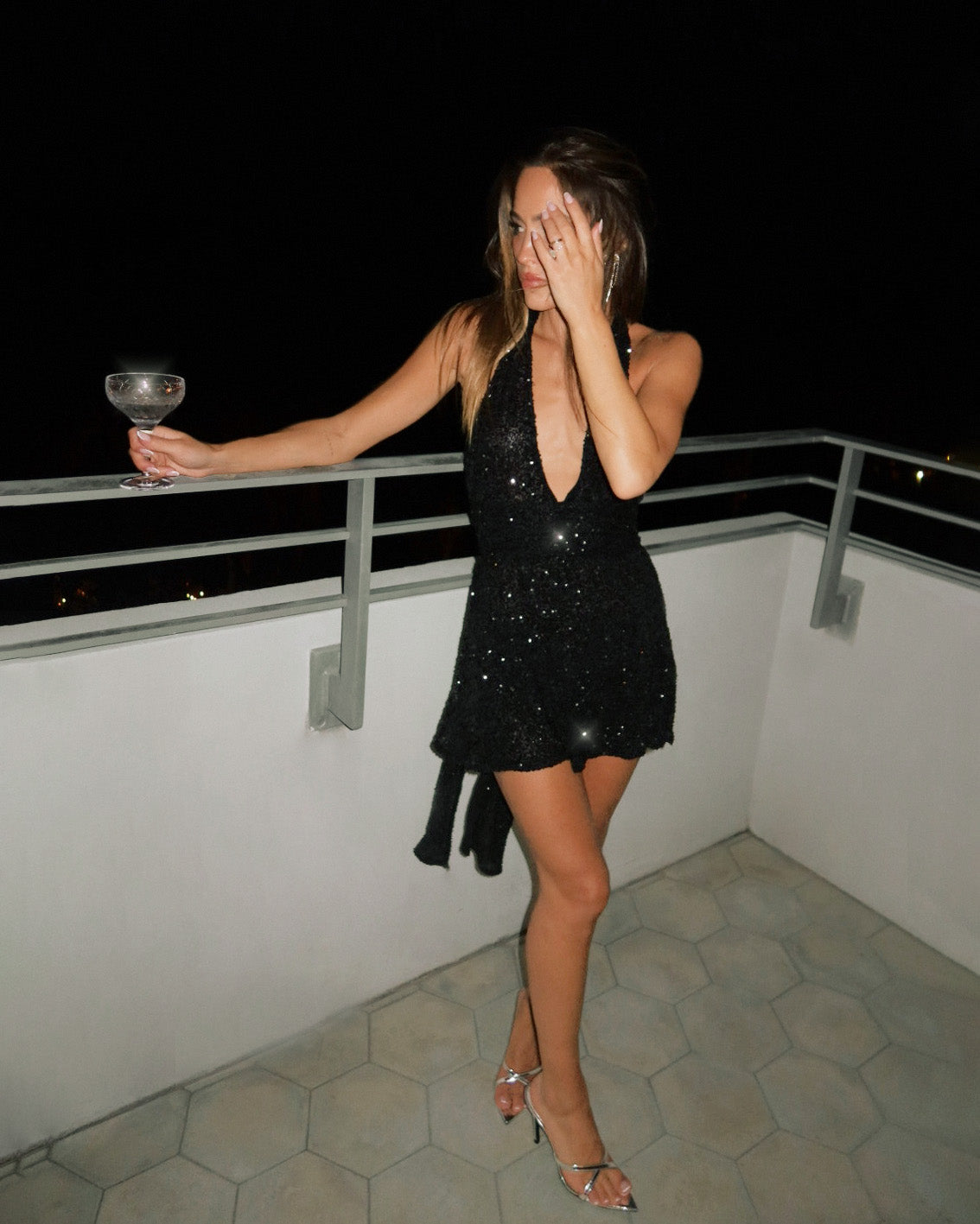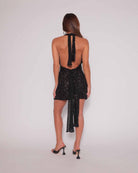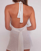 Our Claudia Mini Dress is made from our soft, lightly stretchy sequin knit fabric. It drapes and hugs like a knit sweater for an ultra flattering silhouette. Perfect for bachelorette parties, after parties, and one-year anniversary dinners. Deep v-neckline, backless, tie at the waist, and tie at the neck. Unlined.