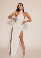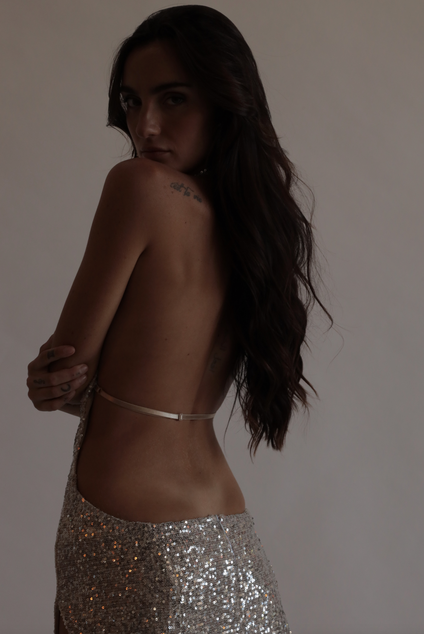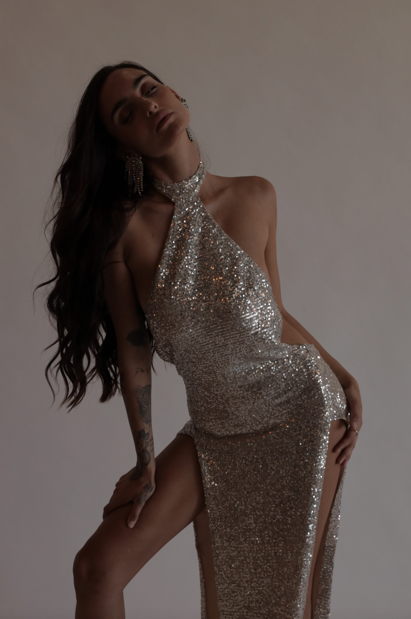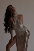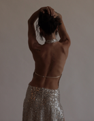 Knit stretch sequin with button closure at neck and side zipper