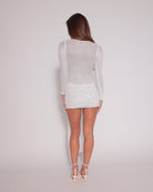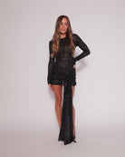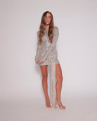 Bridezillas are the real main characters. Aptly named the Main Character Mini Dress, this long sleeved mini dress forms to your body with light stretch. Soft on the inside, ultra sparkly on the outside. Long sash ties at the hip and drapes to floor length. Unlined. Slip on.