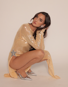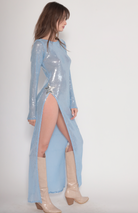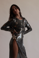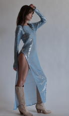 Sequin Maxi Dress with high neckline, long fitted sleeves, ultra high slit and secondary boot slit (you know, to show off those amazing shoes!)