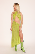 Knit stretch mesh, criss cross halter neckline with tie closure. Elastic waistband and front ring detail.
