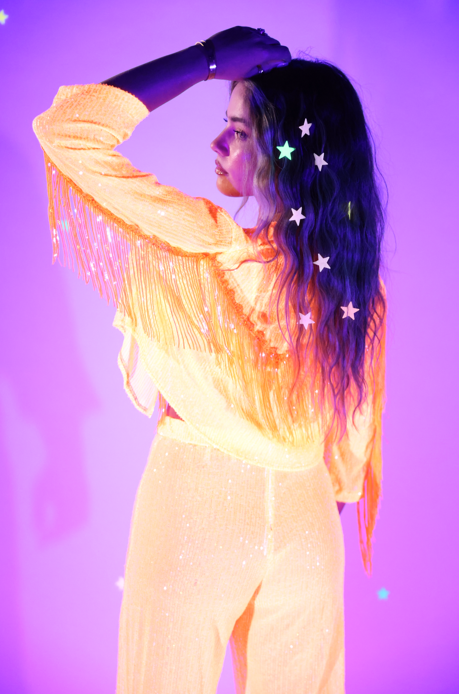 Handmade Gold Square Sequin jacket with bell sleeves and long macrame rayon fringe trim along sleeves and bottom.