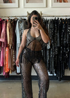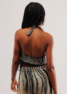 Our Cheri Halter Top is made from our super comfortable, soft on the skin, mirror sequin fabric with handmade macrame and fringe detail. Lined for ultra comfort, flattering fit, and flirty peek-a-boo fringes. Ties at the neck for a perfectly customized fit.