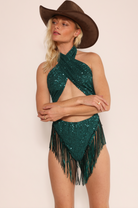 Lined, cheeky fit, adjustable straps, sequin fringe detail