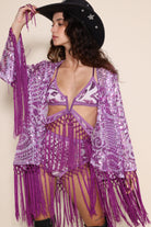 Sequin coverup jacket with small sequins hand embroidered into it. Bell sleeves and long macrame rayon trim with a loose breezy fit.